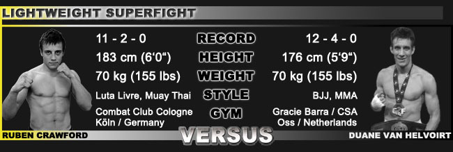 Der ehemalige Respect-Weltergewichtschampion Ruben Crawford tritt mit sofortiger Wirkung im Leichtgewicht an. Die deutsche Nr. 1 im Weltergewicht hatte seinen Titel für vakant erklären lassen und wird von jetzt an seine weitere MMA-Karriere im Leichtgewicht bestreiten. In einem Leichtgewichts-Superfight wird er von dem Niederländer Duane van Helvoirt in der neuen Gewichtsklasse empfangen.