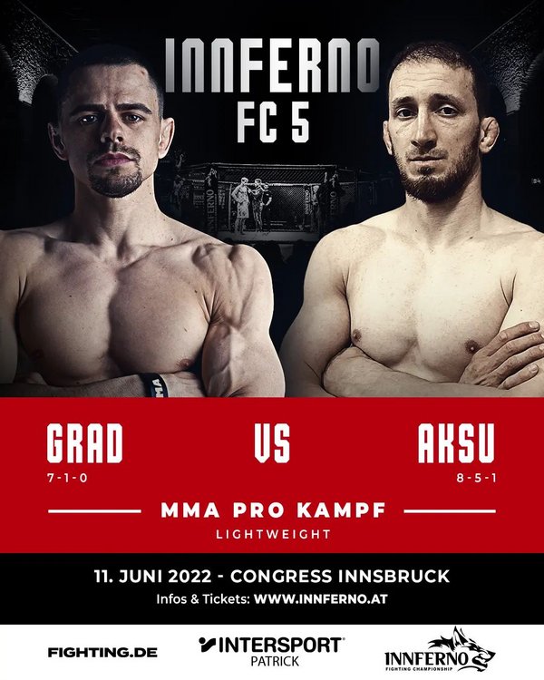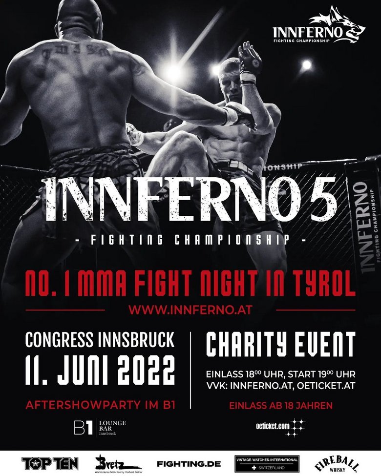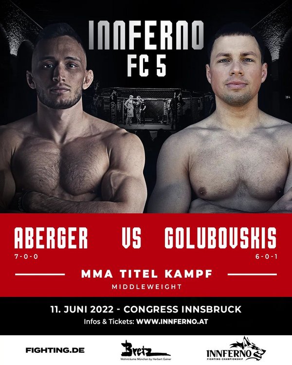 Die 5. Ausgabe von Innferno Fighting Championship ist startklar. Am 11. Juni stehen im österreichischen Innsbruck elf Duelle auf dem Programm, allen voran zwei Begegnungen um Edelmetall. So wird es Andreeas Binder im Kampf um die Krone im Weltergewicht mit dem erfahrenen Roberto Pastuch zu tun bekommen, während Florian Aberger und Erikas Golubovskis um die Vorherrschaft im Mittelgewicht kämpfen. Mit dabei sind auch Action-Garanten wie Bogdan Grad oder Adrian Zeitner. Wir blicken für euch auf das anstehende Kampfprogramm.