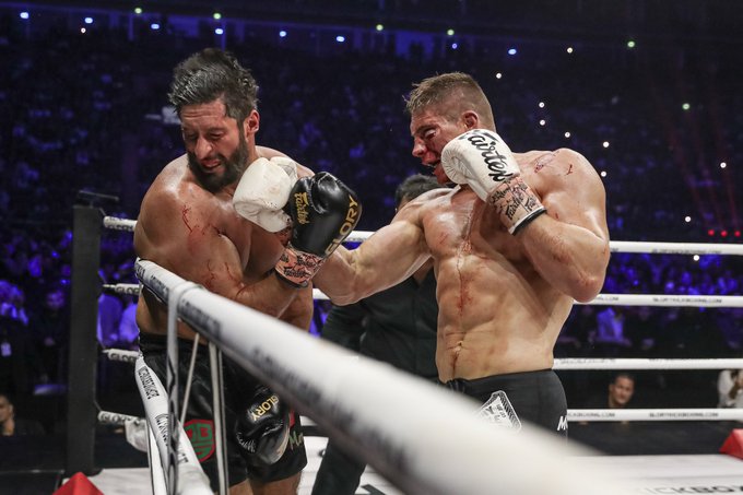 Rico Verhoeven und Jamal Ben Saddik ließen es in dieser Trilogie richtig krachen. Beide Schwergewichte feuerten los, ohne Rücksicht auf Verluste und lieferten den Fans eine großartige Show. Beide Athleten hatten gute Momente, allerdings war es Ben Saddik, der für eine Platzwunde unter dem linken Auge des Champions sorgte, die zudem massiv anschwoll. Verhoeven biss auf die Zähne, schaltete einen Gang höher und konnte so doch den vorzeitigen Erfolg und damit die Titelverteidigung in Runde vier einfahren, nachdem Ben Saddik nach einem Cut im Schienbein und Erschöpfung nicht weiterkämpfen wollte.