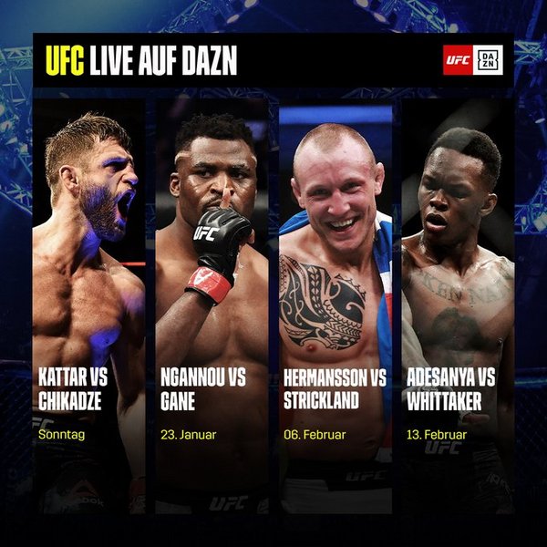 Los ging es am 16. Januar mit dem ersten UFC-Event des Jahres: Giga Chikadze und Calvin Kattar läuten die erste Fight Night für 2022 ein. Das Hauptprogramm könnt ihr im Re-live auf DAZN sehen. Auch die kommenden drei Events wurden bereits auf den offiziellen Kanälen im Social-Media angeteasert.